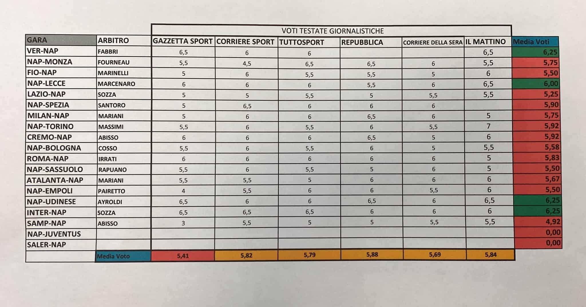 Il giornalista ha studiato i voti che Gazzetta dà agli arbitri. Ne viene fuori una curiosità, quelli che arbitrano una gara del Napoli vengono spesso penalizzati in maniera pesante. Basti pensare che la Gazzetta ha dato 3 in pagella all’arbitro Abisso di Sampdoria-Napoli, solo perché ha concesso due calci di rigore agli azzurri, oltre ad una espulsione contro la Sampdoria. Ma la stessa cosa fu fatta anche con Pairetto.
