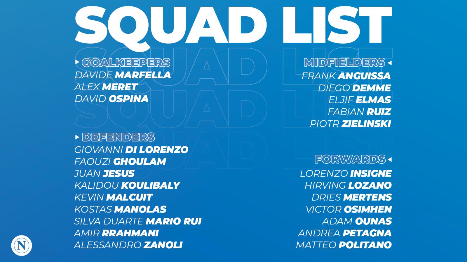 NAPOLI (4-3-3): Ospina; Di Lorenzo, Rrahmani, Koulibaly, Mario Rui; Anguissa, Fabian Ruiz, Zielinski; Lozano, Osimhen, Insigne.