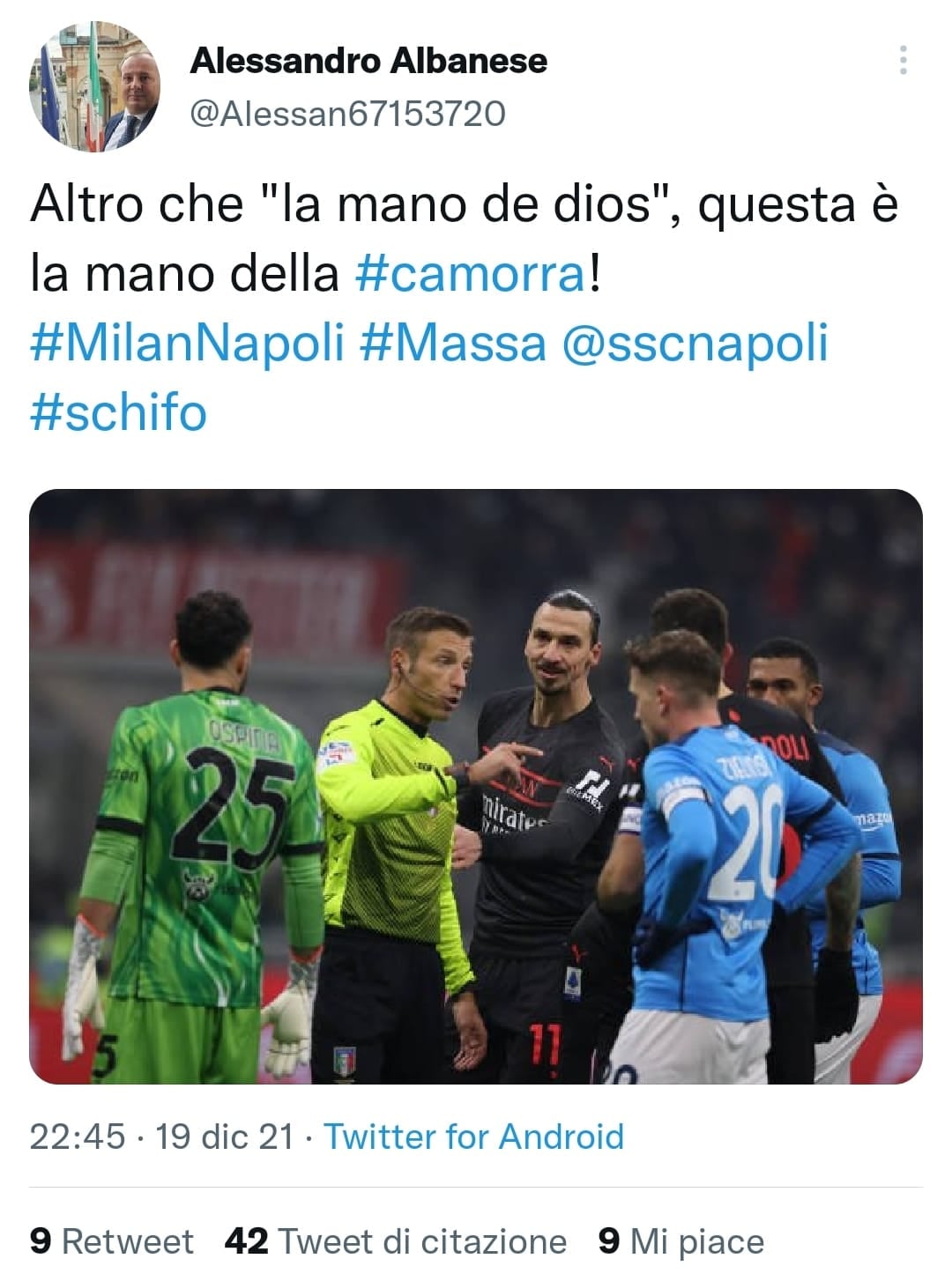 Alessandro Albanese vicesindaco di Cerano ha parlato di Camorra dopo il gol annullato a Kessie in Milan-Napoli, ma ci sono stati altri episodi. Il coraggioso Albanese in mattinata ha pure cancellato il post su twitter in cui parla di camorra al gol annullato al Milan, ma per fortuna gli screenshot non si cancellano e quelli resteranno a futura memoria.