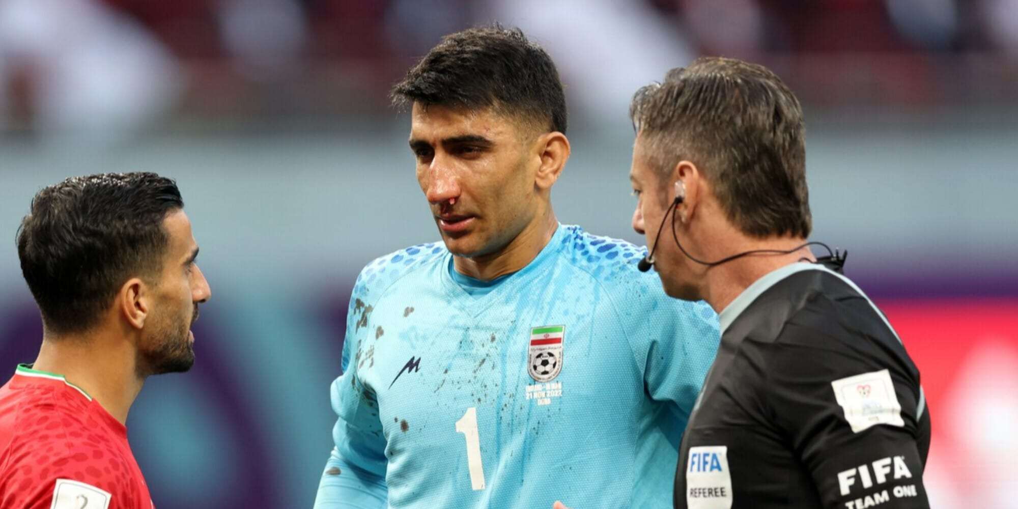 Il terribile scontro tra il portiere Beiranvand ed il compago di squadra Majid Hosseini ha richiesto l’immediato intervento sul terreno di gioco dei sanitari. Il portiere iraniano si è fatto medicare dai sanitari della sua squadra, ed ha tentato di rimanere in campo, ma dopo pochi istanti è stato costretto a lasciare il posto a Hossein Hosseini. Il portiere dell’Iran ha abbandonato il campo in barella dopo appena 19 minuti di gioco. Le cure al giocatore hanno richiesto molto tempo, per questo motivo l’arbitro Claus ha concesso 14 minuti di recupero durante il primo tempo della sfida tra Inghilterra e Iran.