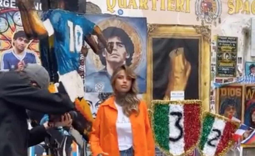 La compagna di Theo Hernandez ha posato per lo scatto davanti al murale di Maradona e all’installazione dei tre scudetti, l’ultimo dei quali è passato dal Milan al Napoli di Luciano Spalletti la scorsa stagione.