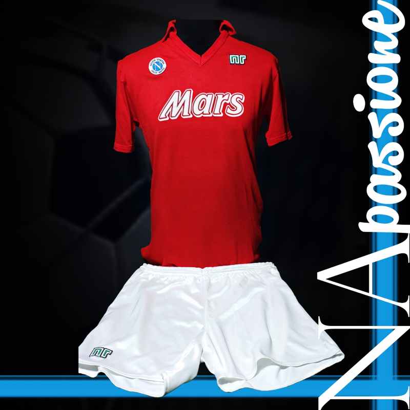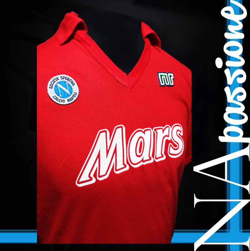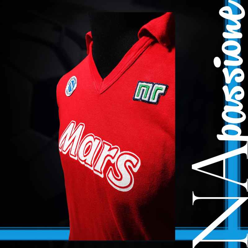 In quella famosissima gara il Napoli indossava una maglia rossa. Quella maglia storica del calcio Napoli fa parte della collezione privata di Enzo D’Orta che l’ha messa a disposizione per la rubrica Na Passione. La maglia match worn rossa di Diego Armando Maradona della stagione 1989/90 utilizzata contro l’Atalanta è realizzata in lanetta leggera, con lo stemma Napoli e lo sponsor tecnico NR cucito. Mentre lo sponsor commerciale Mars è stampato in vernicetta bianca. Il numero della maglia numero 10 indossata da Diego Armando Maradona è in stoffa bianca con cucitura a zig zag, senza alcuna cucitura interna.