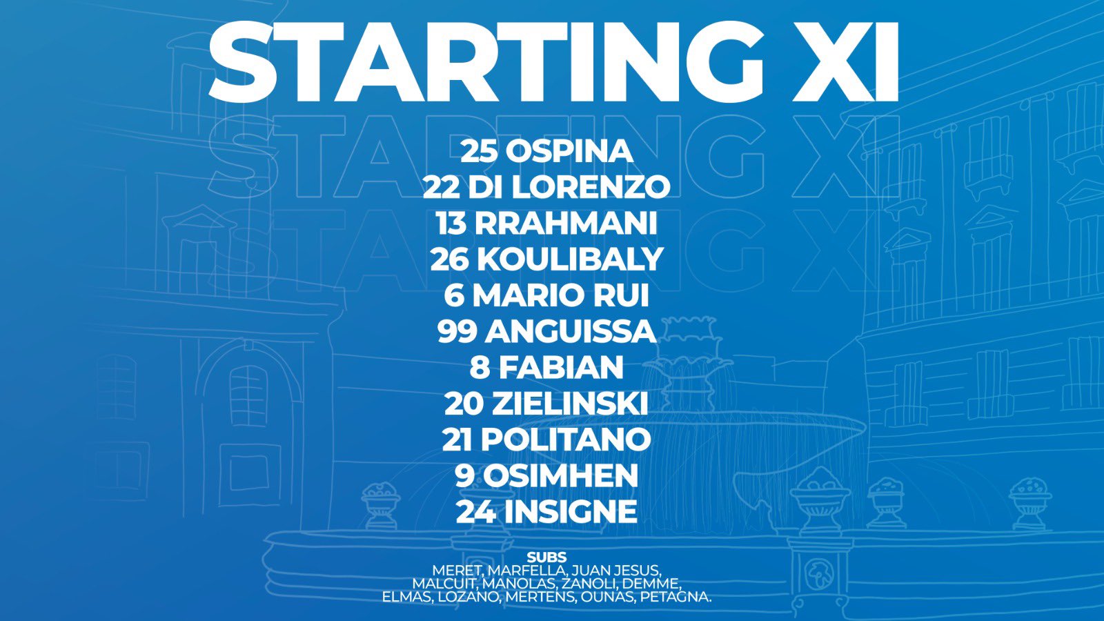 NAPOLI (4-3-3): Ospina; Di Lorenzo, Rrahmani, Koulibaly, Mario Rui; Anguissa, Fabian Ruiz, Zielinski; Politano, Osimhen, Insigne.