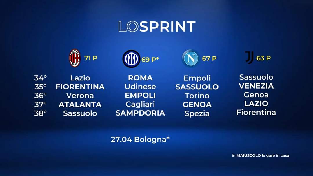 Il Napoli sul calendario ha partite con squadra già tranquille: solo il Genoa lotta per la salvezza, mentre il Torino è già tranquillo, così come il Sassuolo che non chance europee e lo Spezia viaggia verso la tranquillità.