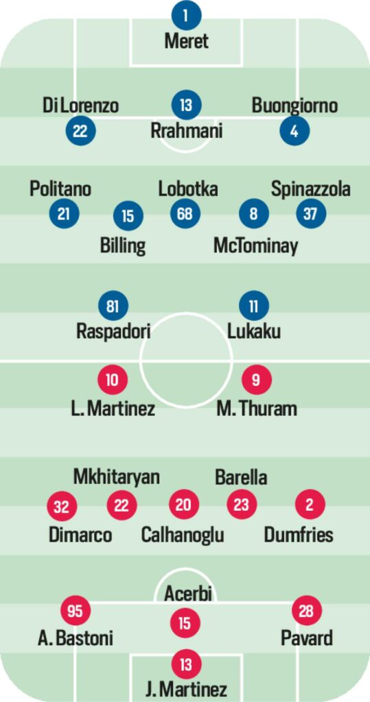 Meret; Di Lorenzo, Rrahmani, Buongiorno; Politano, Billing, Lobotka, McTominay, Spinazzola; Raspadori, Lukaku.