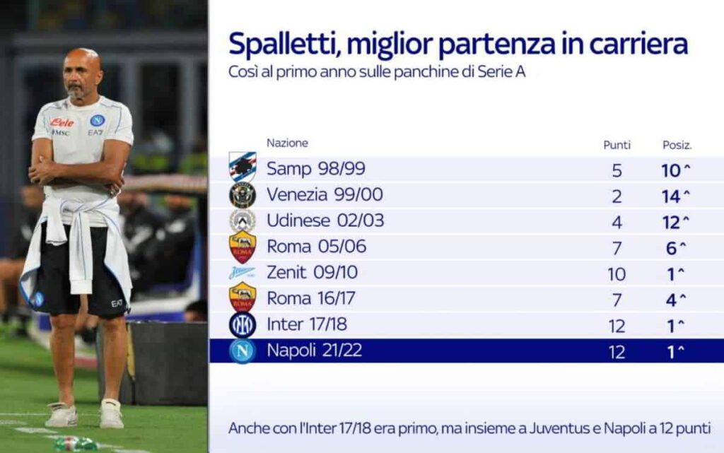 Spalletti ha conquistato un nuovo record: Punteggio pieno e primato solitario in classifica. Tra i precedenti storici a Napoli si ricordano altre partenze a punteggio pieno dopo quattro giornate (ma non c’era il primato solitario), oppure il primo posto da soli in classifica alla 4^ (ma non a punteggio pieno). Nessuno è come Spalletti, che era partito così bene in carriera solo con l’Inter.