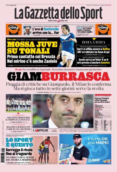 C’è la crisi del Milan sulla prima pagina della Gazzetta dello Sport con il titolo “Giamburrasca” e sottotitolo: “Piogge di critiche su Giampaolo, il Milan lo conferma ma si gioca tutto in sette giorni: serve la svolta”. Un occhio anche al calciomercato con il titolo: “Mossa Juve su Tonali”.