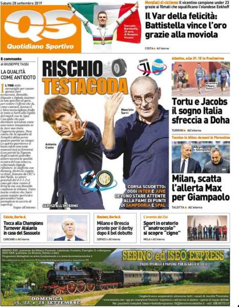 Tra le prime pagine dei quotidiani sportivi su Corriere dello Sport si parla anche di razzismo, richiamando la notizia degli insulti a Pjanic. “Razzismo i cori di massa” il richiamo in prima del quotidiano che si focalizza anche sulla sfida a distanza tra Inter e Juventus: “Conte alla rovescia” il gioco di parole per lanciare il countdown della sfida tra Conte e Sarri che si terrà tra otto giorni a Milano. Anche Qs ha in prima pagina la sfida tra Inter e Juve con il titolo: “Rischio testacoda”.