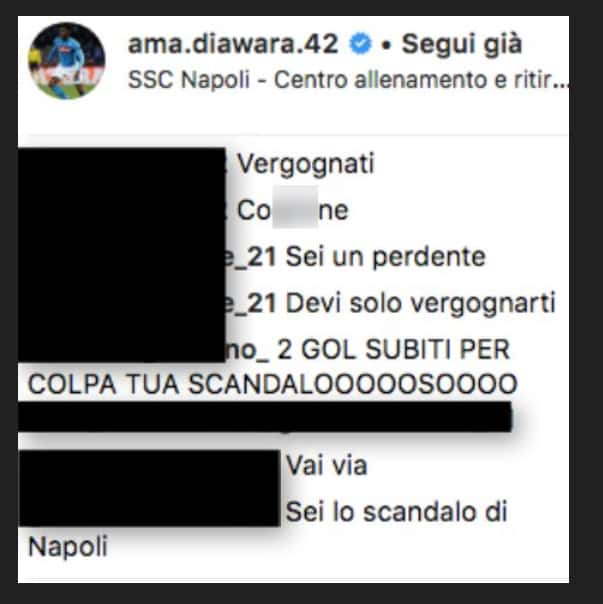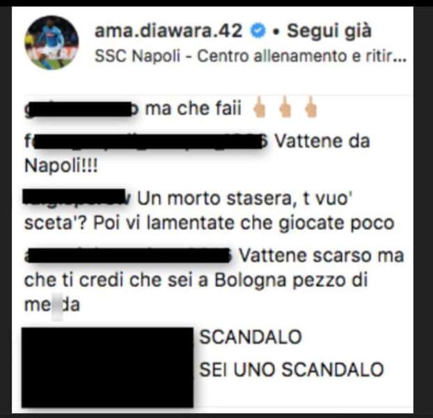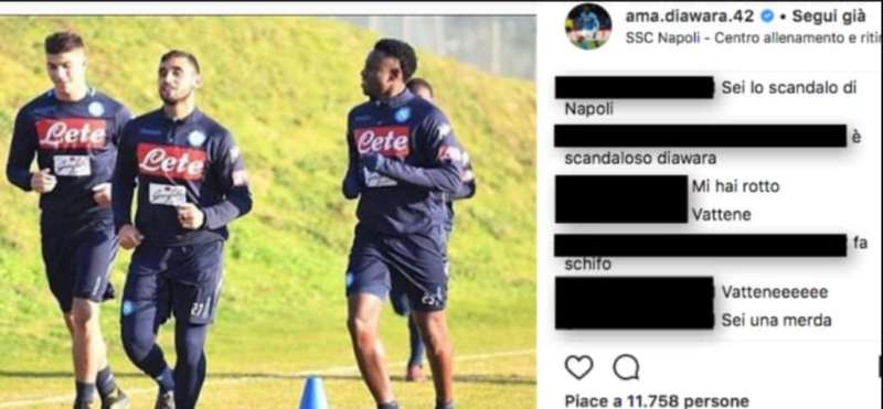 Amadou Diawara era uno dei più attesi nella sfida di Europa League contro il Lipsia, ma è forse quello che ha deluso di più. I tifosi a fine partita si sono scagliati contro il centrocampista maliano, inondando di messaggi offensivi e insulti: “vattene da Napoli” scrive un tifoso, “vattene sei una merxa”… e tanto altro ancora è stato pubblicato sui profili social del giocatore.