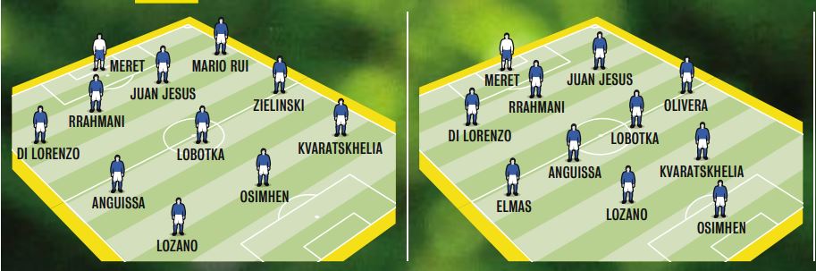 Ma Spalletti pensa anche al modulo 3-4-2-1 che Gazzetta vede così: Meret, Di Lorenzo, Rrahmani, Juan Jesus; Elmas, Anguissa, Lobotka, Olivera; Lozano, Kvaratskhelia, Osimhen.