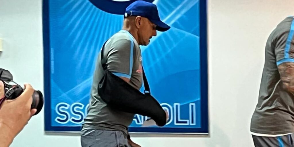 Luciano Spalletti, con il tutore per l'incidente alla clavicola