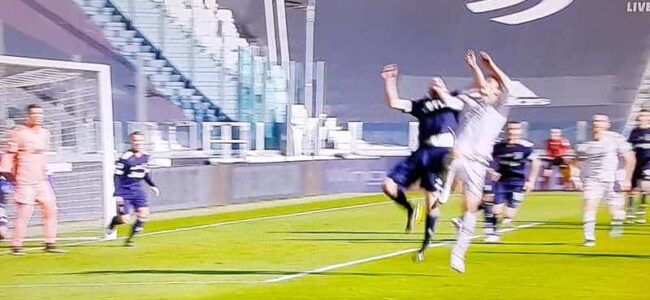 Arbitro Sacchi. Rigore negato al Bologna, Chiellini dà una gomitata in faccia a Tomiyasu in area. L'arbitro assegna la punizione...
