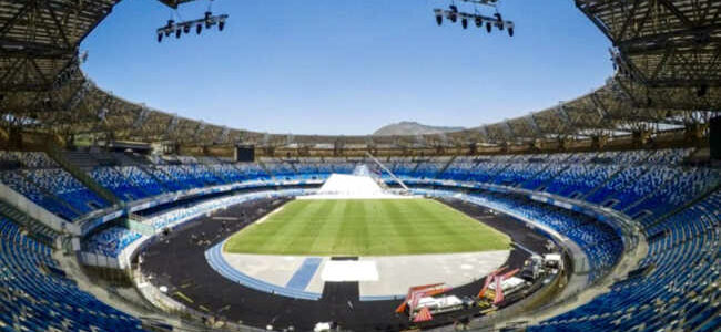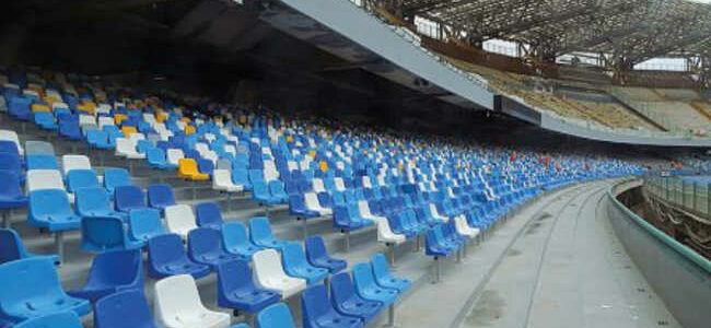 San Paolo, curva B senza sediolini per la scenografia dell’Universiade. Completata la pista d’atletica. Sarà creata la scritta «Napoli» nei...