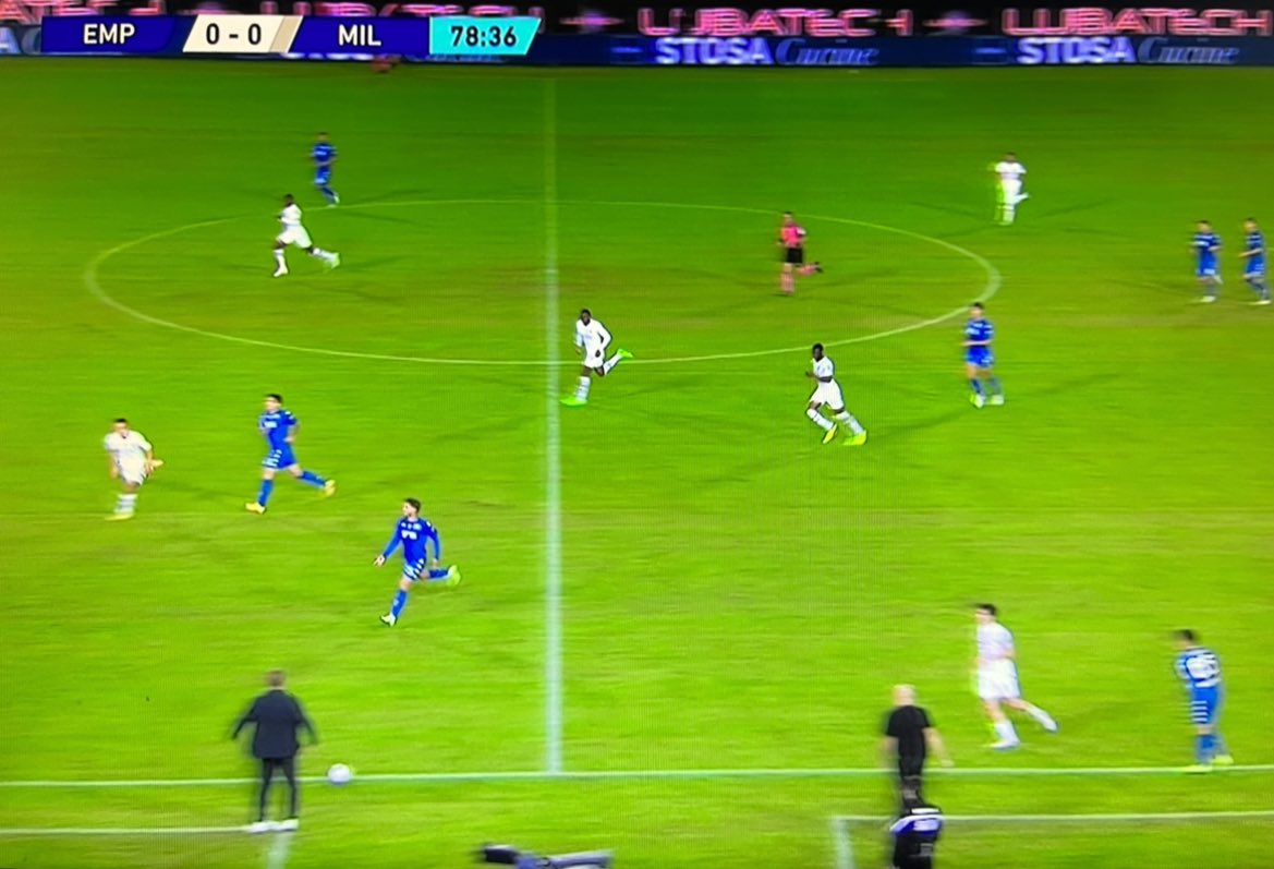 La protesta nasce dal fatto che Tonali batte la rimessa laterale nella metà campo dell’Empoli, mentre il pallone era uscito nella metà campo del Milan. Dalle immagini di Sky si vede che Tonali batte la rimessa 10,46 metri più avanti del dovuto. Una posizione che permette al giocatore del Milan di fare arrivare con le mani quella palla in area di rigore. Da lì nasce il gol di Rebic. Ovviamente battendo quella rimessa più indietro l’azione si sarebbe sviluppata diversamente.