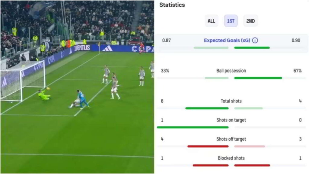 Tutto nasce da un calcio di punizione battuto da Zielinski, Bremer interviene di testa ma centra Gatti e la palla arriva al difensore dei partenopei. La botta al volo non s’è concretizzata in rete solo per la grandissima parata d’istinto di Szczesny: con la mano di richiamo, il portiere trova la deviazione provvidenziale.